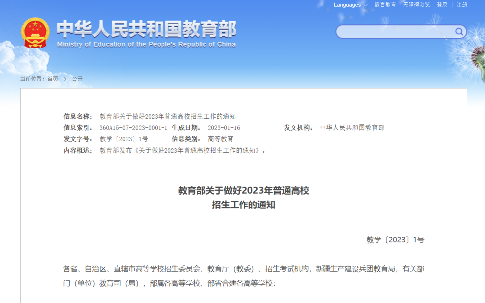 教育部印发《关于做好2023年普通高校招生工作的通知》,对2023年普通高校招生工作作出部署。