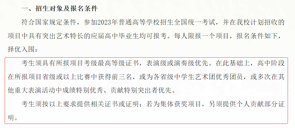 【招生对象及报名条件】考生须具有所报项目考级最高等级证书,表演级或演奏级优先。在此基础上,高中阶段在所报项目省级或以上比赛中获得前三名,或为各省级中学生艺术团优秀团员,或多次在其他重大表演活动中成绩特别优秀、贡献特别突出者优先。